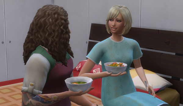 赤さんを寝かしつけたあと、仲良くご飯を食べる二人。