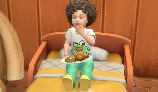 ハングドマン用にベビーチェアに一人前乗せたのに、ごちそう会開始のアクションで自力で取ってベッドで食べ始めました。
