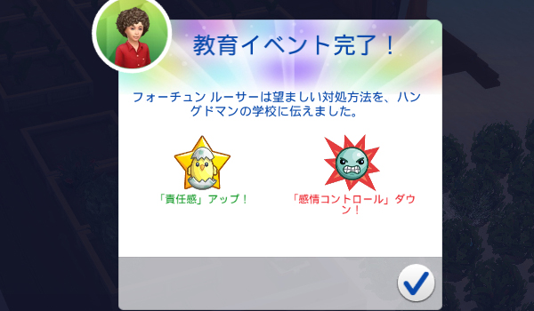 感情コントロールがダウンしてしまいましたが、今は責任感のほうが高いし、ジャスティスの願望「子育ての達人」にも関係しますからね。