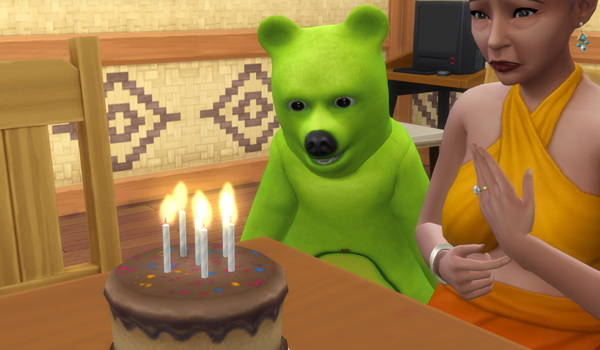 熊のせいで全然表情見えないけどロウソクを吹き消してます。